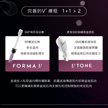 蝴蝶電波 (溫和啟動): 溫和加熱陰道黏膜,啟動膠原蛋白再生、緊緻組織,並提升後續訓練效率。VTone (深層訓練):利用電脈衝,深層強化訓練盆底肌。