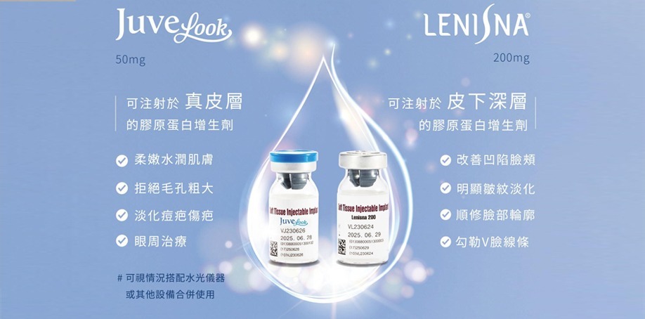 喬雅露提供兩款劑型,結合大分子Lenisna與小分子Juvelook,可綜合改善面部的凹陷、皺紋、細紋、痘疤、膚質、淚溝、頸紋等多項問題,此外身體肌膚鬆弛、紋路與生長紋/妊娠紋等困擾,也都可一併改善。