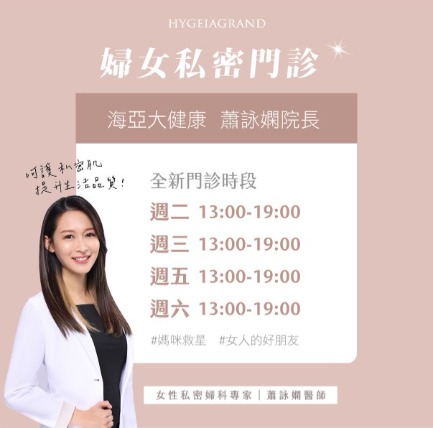 海亞大健康蕭詠嫻醫師,婦女私密門診時段:每週二、三、五、六,13:00~19:00