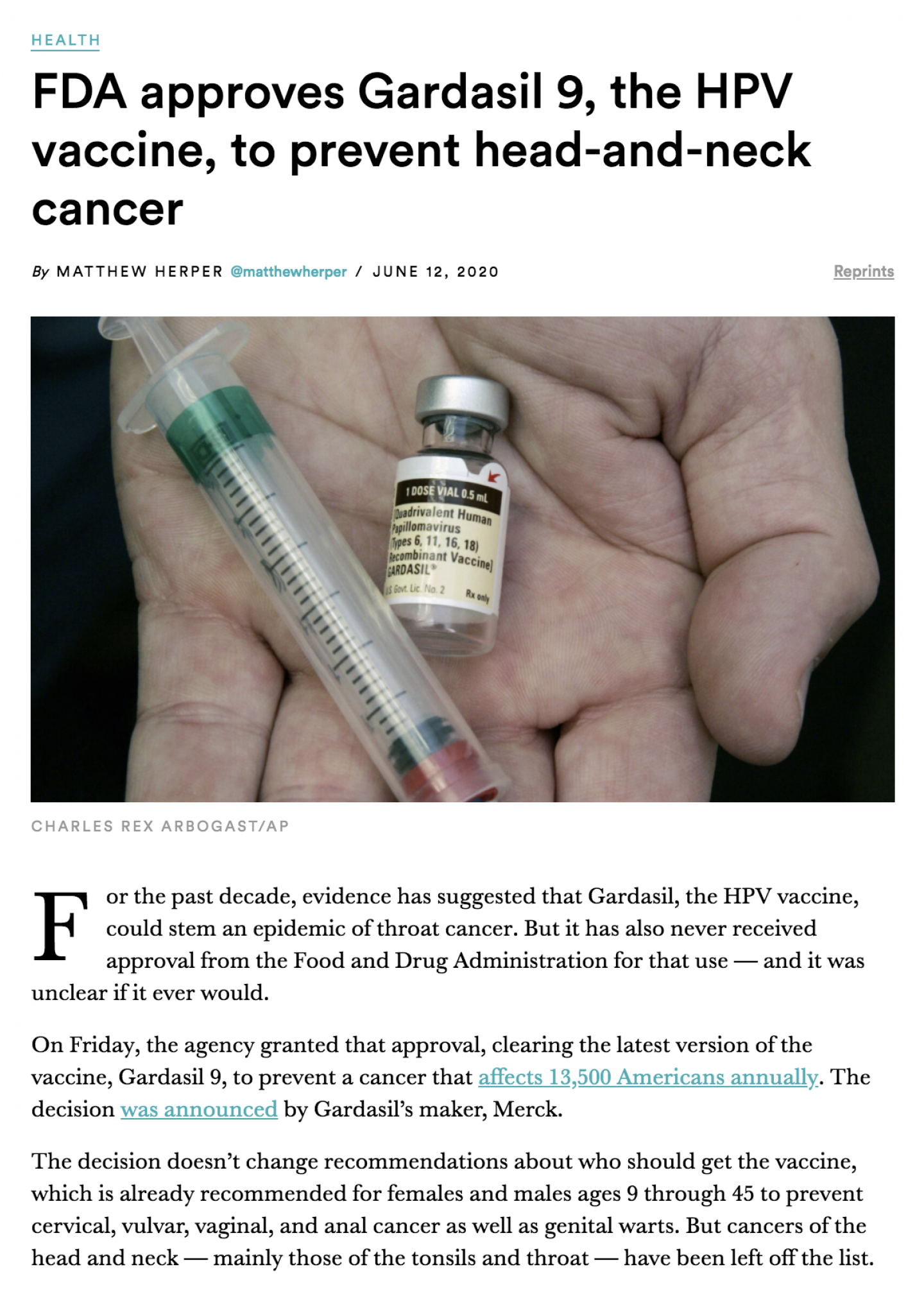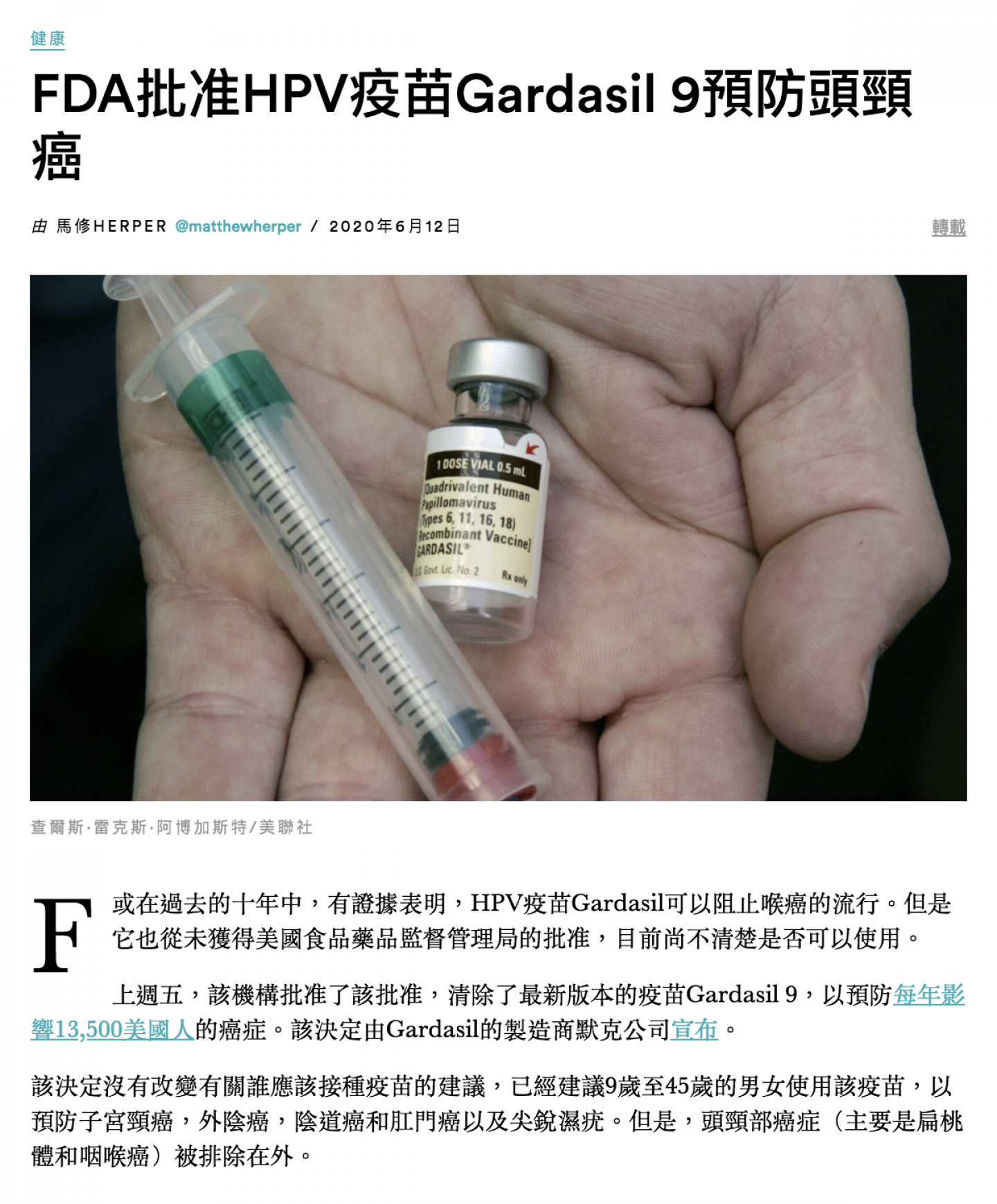 美國FDA批准HPV九價疫苗,嘉喜Gardasil 9預防頭頸癌